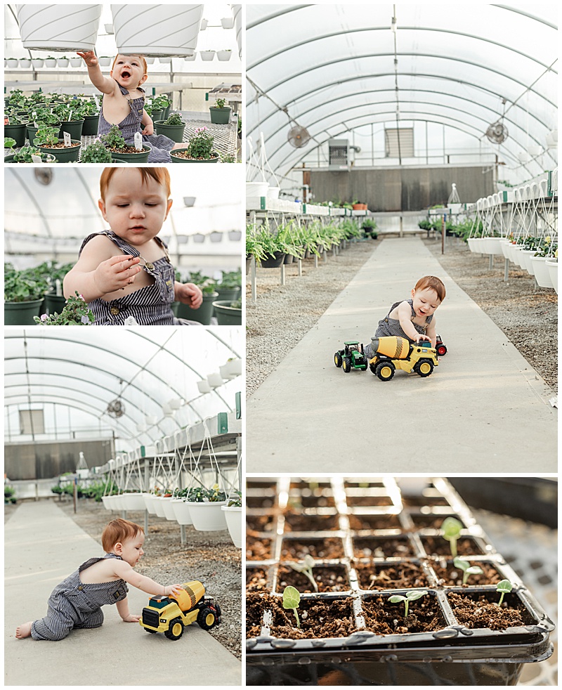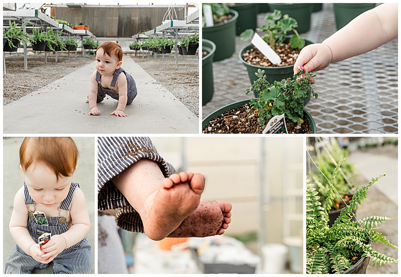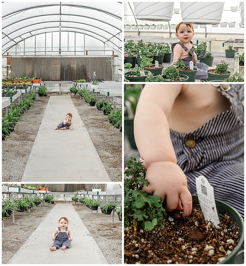 Nine months old and endlessly curious, Clyde explored Amy’s classroom greenhouse with unstoppable energy and a little mischief. The air was damp, sweet with the smell of flowers, and filled with the gentle hum of the heaters. Every corner was alive with color and texture, making it the perfect spot for a 9-month session to capture his personality and the small, fleeting moments of babyhood.